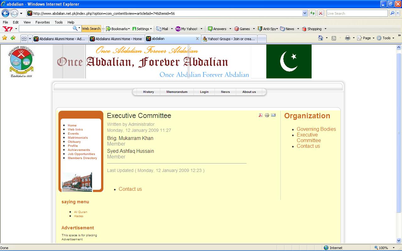 The information which was only just published yesterday, on Monday, 12-Jan-2009 is years old and may just be misleading to many Abdalians spread across the world who may think that the people mentioned on the web page are the current office bearers. The following Abdalians were elected as Members of the Executive Committee at the last AGM held at Cadet College hasanabdal on 27th January, 2008: 1. Mr. Saleem Akram (14th Entry) The following Abdalians were taken on board as co-opted Members of the Executive Committee: 1. Mr. Asmat Saleem (17th Entry)