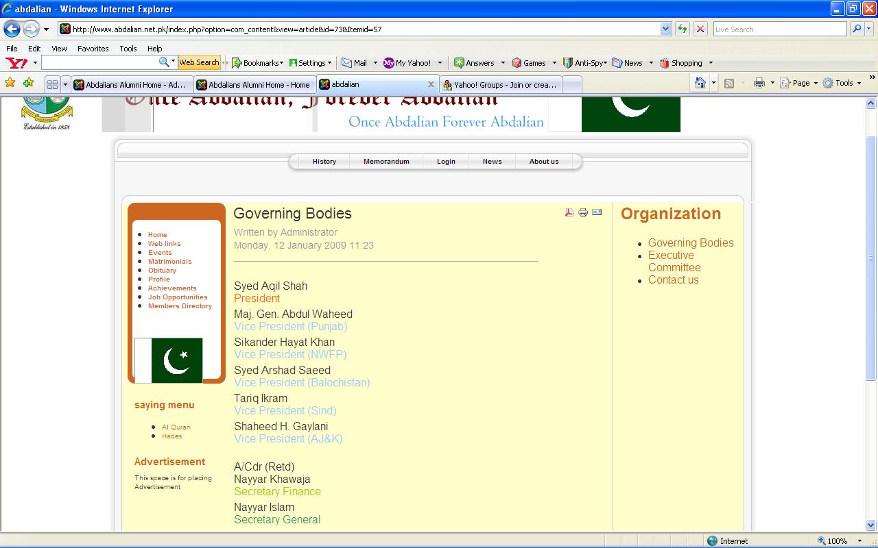 An interesting scenario was witnessed on visiting the official site of Abdalians' Association on Tuesday, 13-Jan-2009. The information published under the "Governing Bodies" and the Executive Committee does not portray the current status of the Associations' "Governing Body". According to the information published, the Governing "Bodies" include Syed Aqil Shah as the President of the Association. In actual fact, the current President of the Association is Syed Ashfaq Hussain, who was unanimously elected at the last Annual General Meeting held in January 2008. Similarly, The Vice Presidents of various chapters are being mentioned incorrectly. For example, Brig. Rashid, who is the Vice President Sind Chapter does not appear anywhere on the site. Instead, it is Mr. Tariq Ikram, who was an earlier office-bearer appears as the current Vice President. Surprisingly enough, the information is as current as Monday, 12th January, 2009. |