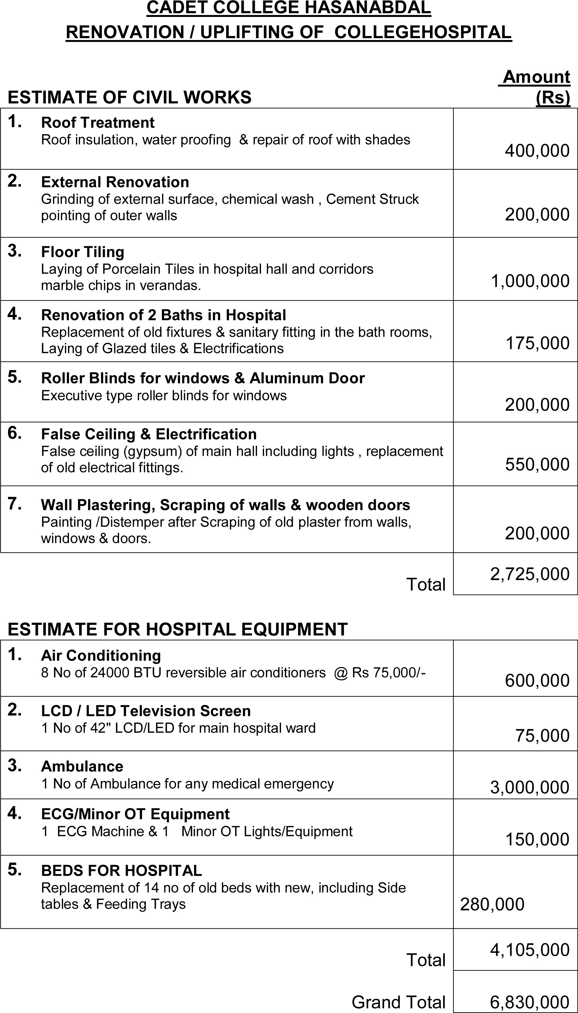 Ever since I took over the charge of Cadet College Hasanabdal, which is the 3rd of January 2013, I have been trying to identify the problem areas needing our attention. Out of many, there is one area which deserves to be treated as a test case, and that is, the College Hospital. It is in a state of considerable disrepair, both from the stand point of fixtures and equipment, as well as of infrastructure. The roofs are leaking, floors settling and wall plasters coming apart. In short, the main Cadets’ hall presents an extremely depressing picture and needs to be re-done in a major way. My desire is to upgrade the hospital in every way with state of the art equipment and facilities to provide reasonable medical service to the Cadets and Staff. This would need a hefty sum of Rs. 6.83 Million, the details of which are attached separately.